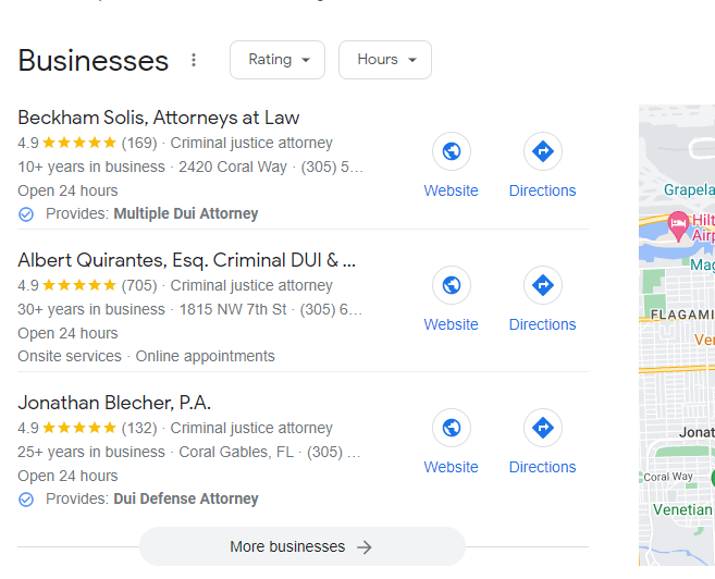 它展示了迈阿密的酒驾律师名单,旁边是一张地图。这应该是一个目标,因为它包括您的网站链接、营业时间、电话号码和路线——非常适合将潜在客户直接引导到您的办公室。